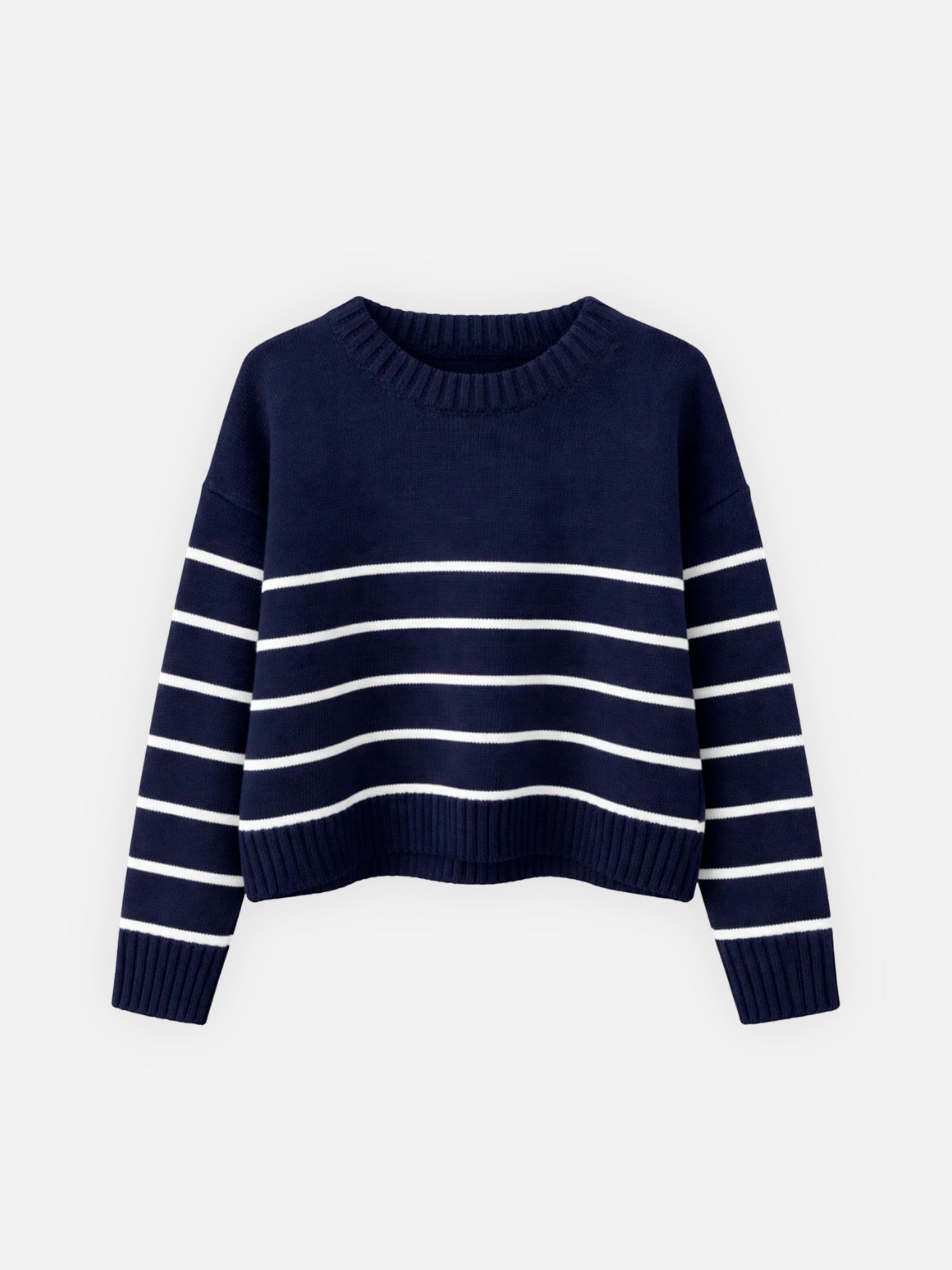 Made from soft cotton, this navy sweater with white stripes is knitted in a relaxed silhouette with dropped shoulders. A true wardrobe staple, it pairs effortlessly with anything and never goes out of style.